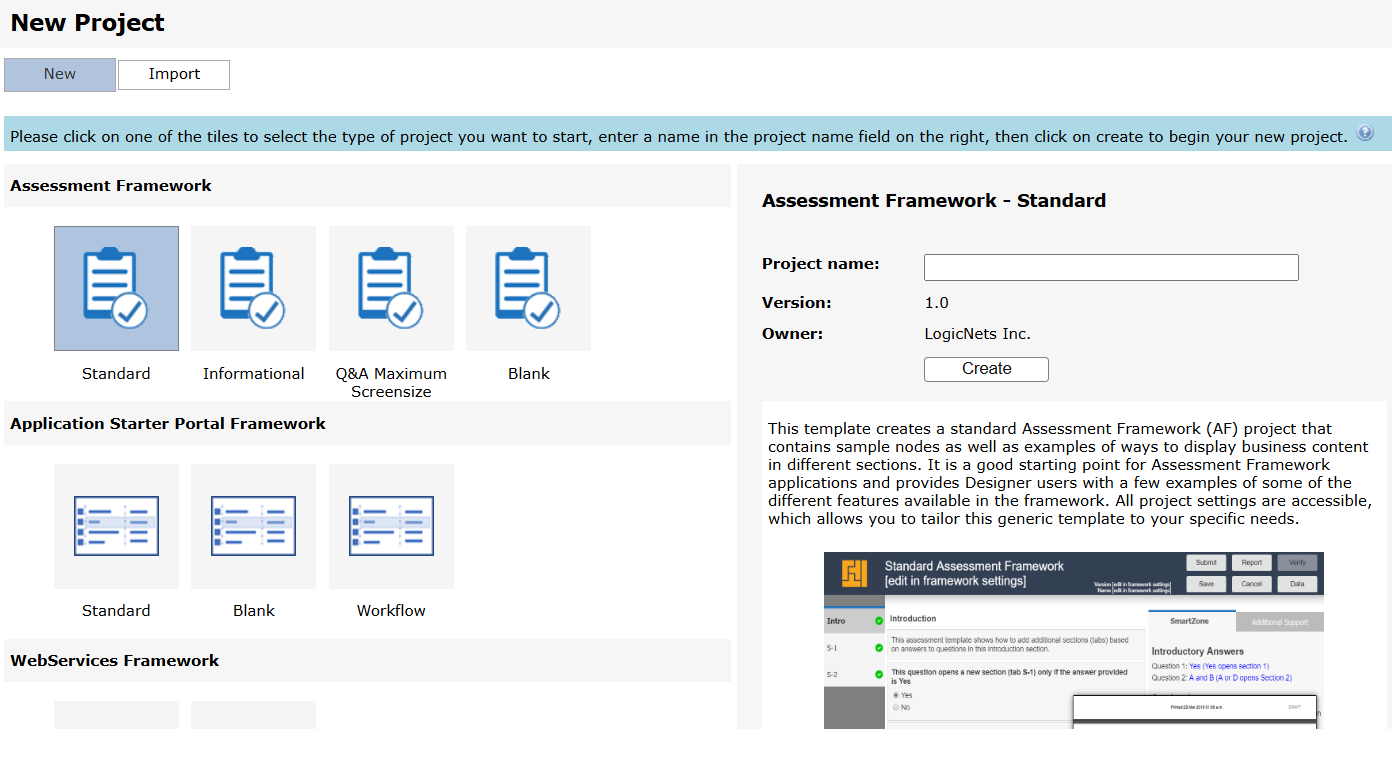 To access other frameworks, including variations of the above, and frameworks customized by LogicNets for your use, choose the blank template in the Advanced section (further down on the screen shown above).
