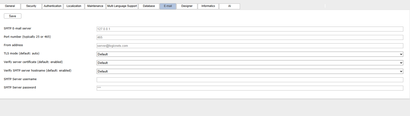 With LogicNets v8.4, the system supports sending email without a localhost email relay service, such as IIS6 or MailEnable. The system does still require a company/cloud-based email server, for example, Amazon SES or Microsoft Exchange. As part of these changes, LogicNets added the following settings to the system configuration: