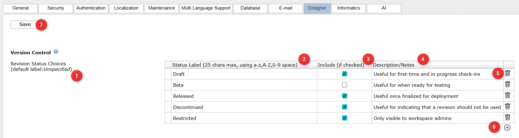 To add, remove, or modify a status label, navigate to the System Configuration package (requires permission via the User Management module) and click on the Designer tab to access the screen below.