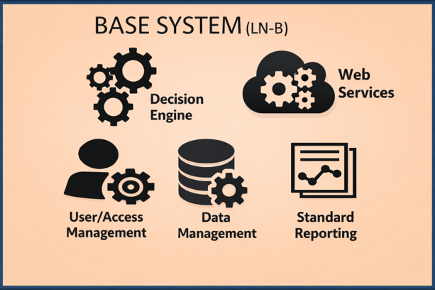 The Base System is the core functionality of the LogicNets run-time system. It includes the LogicNets decision engine; the range of parts that represent user-configurable functions and operators that can be executed in a decision step; web services-based connectors for secure interactions with both internal system clients and external environments; embedded data management; and all other aspects of runtime execution. The LogicNets decision engine processes data objects from the data model for each active user session and also provides a persistent data store for system and user application data in the embedded RDBMS. The base system collects and organizes a standard set of data from running sessions to enable “standard reporting” for analyzing a variety of usage factors.