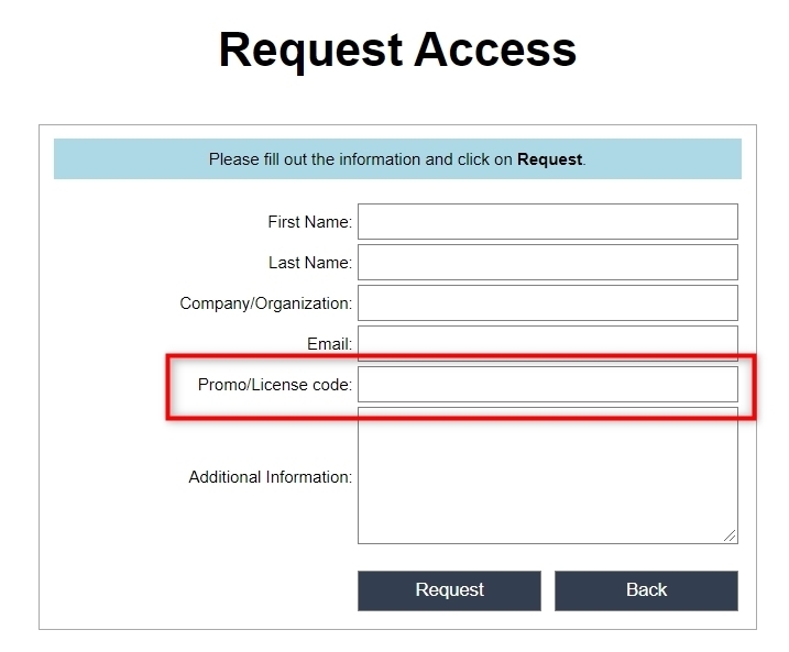 Any user coming to the specific application's logon page can enter a license code by clicking on Request Access and entering their info and code at the Request Access screen. Based on configuration, the user can be given access automatically, or is added to a list pending approval.