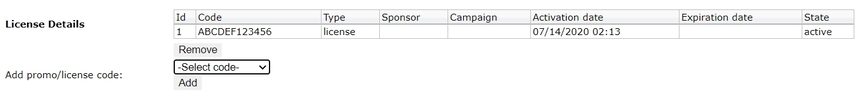 As an alternative to the self service, any user account can be created in the usual way and have one or more license/promo codes associated with their account. On the main page of the user's account, locate the License Details section, shown below.